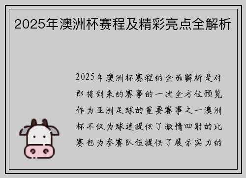 2025年澳洲杯赛程的全面解析是对即将到来的赛事的一次全方位预览。作为亚洲足球的重要赛事之一,澳洲杯不仅为球迷提供了激情四射的比赛,也为参赛队伍提供了展示实力的舞台。本篇文章将从四个方面深入分析2025年澳洲杯的赛程安排、参赛球队、精彩亮点以及对赛事的预测。通过详细阐述赛事的各个层面,帮助读者全面了...